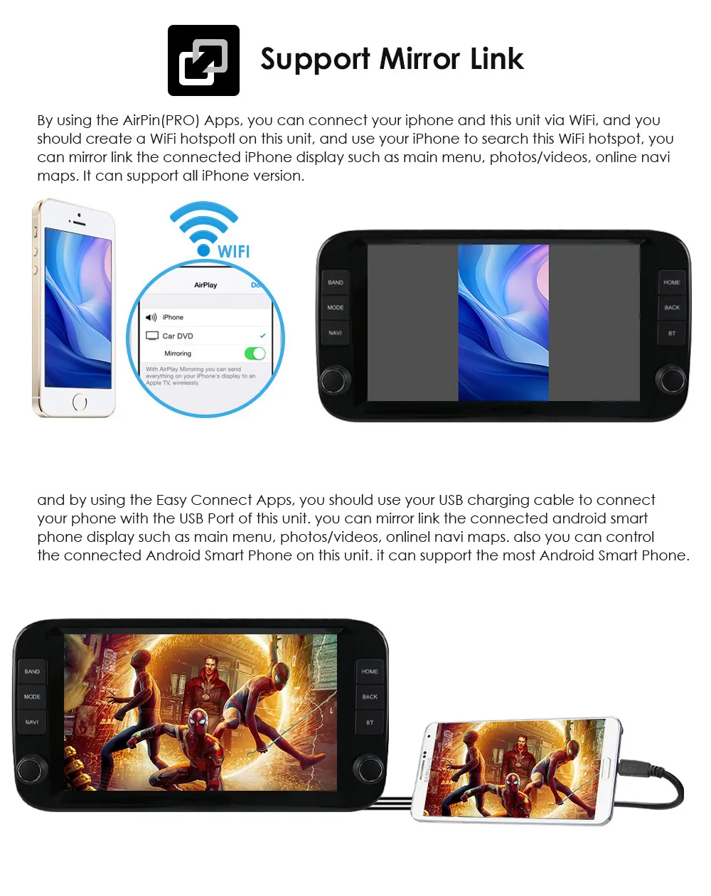Supporta le funzioni di mirroring cablate e wireless di iPhone e telefoni Android